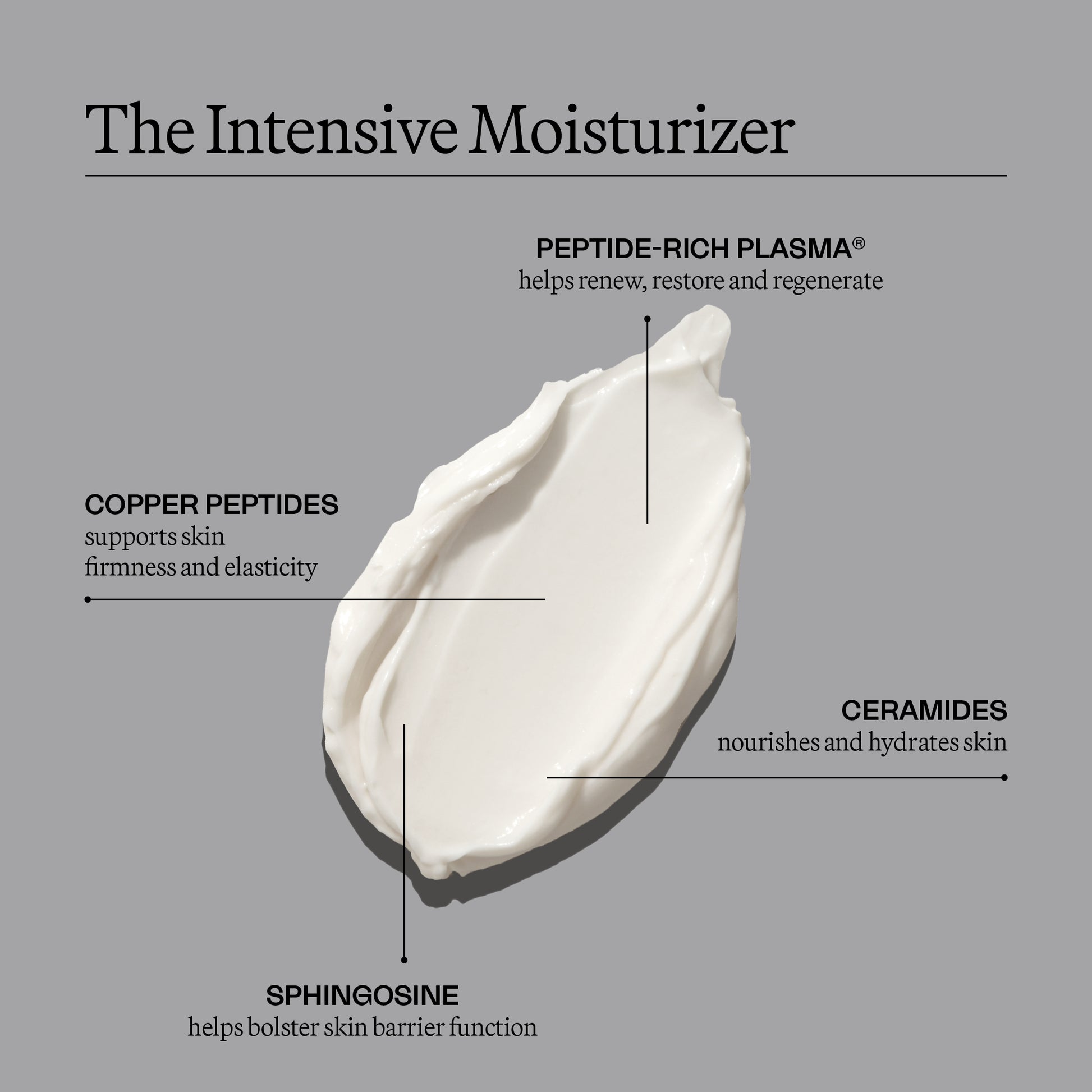 Aqua/Water/Eau, Caprylic/Capric Triglyceride, Butyrospermum Parkii (Shea) Butter, Cocos Nucifera (Coconut) Oil, Glycerin, Elaeis Guineensis (Palm) Oil, Polyglyceryl-10 Stearate, Aloe Barbadensis Leaf Juice, Propanediol, Lecithin, Peptide-Rich Plasma® (sh-Oligopeptide-2, sh-Polypeptide-1, sh-Polypeptide-9, sh-Polypeptide-11, Acetyl Hexapeptide-8, sh-Oligopeptide-1, Palmitoyl Tripeptide-5, Palmitoyl Tetrapeptide-7, Acetyl Glutamine, Sodium Hyaluronate, Lysine HCL, Alanine, Histidine HCL, Arginine, Serine, Proline, Glutamic Acid, Threonine, Valine, Leucine, Glycine, Isoleucine, Phenylalanine, Taurine), Bacillus/Folic Acid Ferment Filtrate Extract, Caprylyl Glycol, Butylene Glycol, Polysorbate 20, Polyglyceryl-6 Distearate, Glycosphingolipids, Glycolipids, Methylglucoside Phosphate, Copper Lysinate/Prolinate, Hydrolyzed Hyaluronic Acid , Lavandula Angustifolia (Lavender) Oil, Phytosphingosine, Ferulic Acid, Retinyl Palmitate, Adansonia Digitata (Baobab) Seed Oil, Hydrolyzed Linseed Extract, Allantoin, Resveratrol, Pichia/Resveratrol Ferment Extract, Ergothioneine, Rosmarinus Officinalis (Rosemary) Leaf Extract, Xanthan Gum, Acrylates/C10-30 Alkyl Acrylate Crosspolymer, Sodium Hydroxide, Ethylhexylglycerin, Caprylhydroxamic Acid.